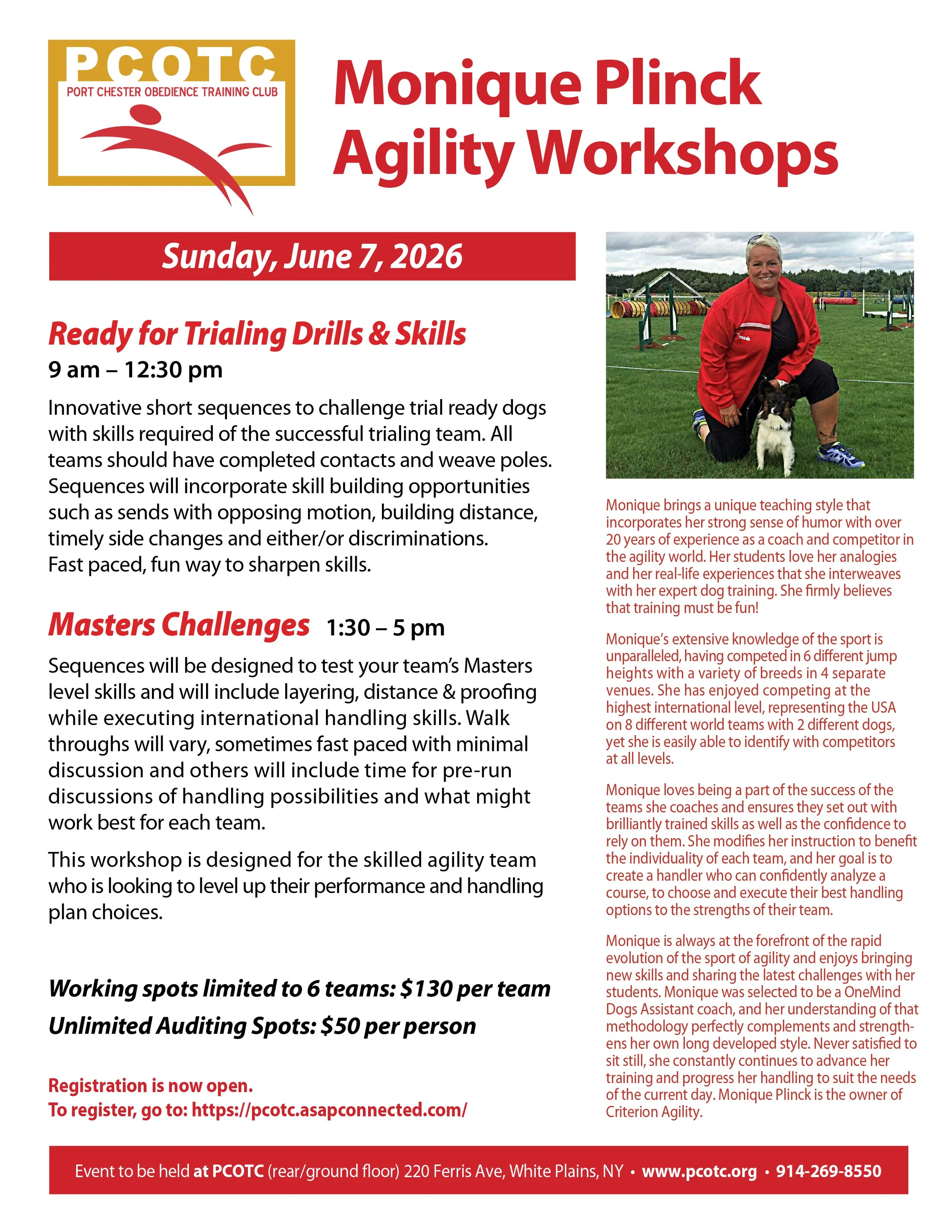 Monique Plinck Agility Workshops Sunday, June 7, 2026 9:00 AM 5:00 PM 09:00 17:00 Port Chester Obedience Training Club 220 Ferris Avenue White Plains, NY, 10603 United States (map) Google Calendar ICS